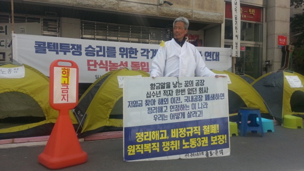 ▲ 콜텍 본사 앞에서 점심 선전전 피켓팅을 하고 있는 임재춘 씨 [출처: 연정 작가] |