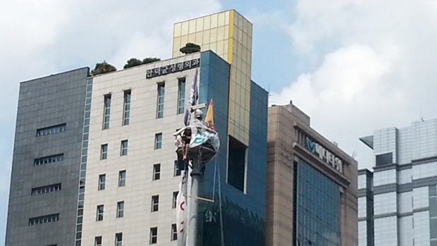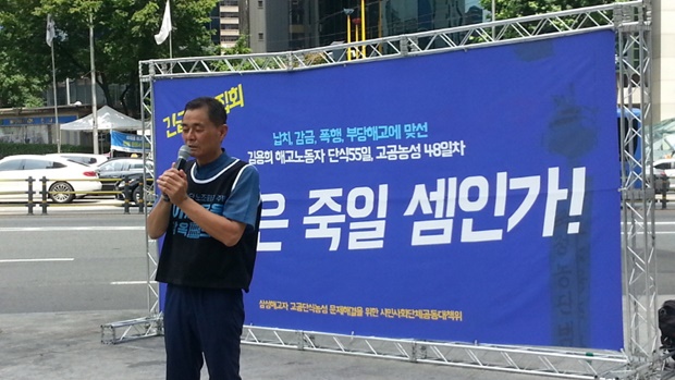 “동지 여러분 정말로 눈물 나게 고맙고 감사합니다. 저도 노조를 포기하지 못했다는 그 이유만으로 입에 담을 수 없는 탄압들을 받아왔습니다. 여기서 삼성 옥상 위에 나무를 보면서 옥상 위에 나무 한그루보다 못한 노동자의 처지를 생각했습니다. 삼성의 윤리의식이 이 사회를 지배하고 삼성이 초인류 기업이라는 명판을 달고 있는 이게 나라인가 싶네요. 7월 10일이 제 생일이었습니다. 정년퇴임일 이었습니다. 여기 올라올 때, 그 안에 삼성의 문제가 해고자의 문제가 해결되지 않으면 저는 죽으려고 했었습니다. 그런데 동지 여러분이 우리 삼성 해고노동자들에게 빛이 되고 생명이 되서 다시 마음을 바꾸고 살아서 끝까지 싸우기로 했습니다.”