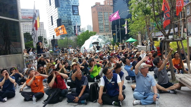 ▲ 집회를 마무리하며 김용희 씨를 바라보고 구호를 외치고 있는 참가자들 [출처: 연정] |