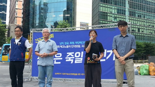“삼성이 인간이라면 무슨 대책이 나왔을 거라고 생각합니다. 물론, 삼성에서 직업병으로 죽어나가고 테러를 하고 이런 못된 짓을 저지르고도 삼성은 자기가 안했노라고 직접 한 게 아니라고 합니다. 아무리 그렇더라도 아무리 그런 악랄한 삼성이라도 고공 철탑 위에서 빼짝 말라 비틀어지고 살이 다 빠지고 죽어가는 꼬라지를 보고 있으면서 아직까지 일말의 말이 없고 대응이 없습니다. 사람이기를 거부한 것을 지나서 쟤네들은 이미 사람이 아닙니다.”