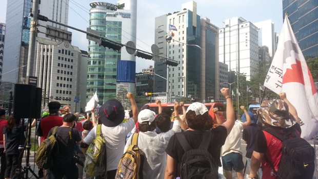 삼성 해고노동자 김용희 씨의 단식농성 55일, 20미터 높이의 강남역사거리 CCTV 철탑 고공농성 48일이 되는 7월 27일 오후, 삼성 본관이 있는 강남역 8번 출구 앞. 간급 규탄집회 ‘삼성은 죽일 셈인가?’에서 이재용 씨가 투쟁경과 보고를 한다.
