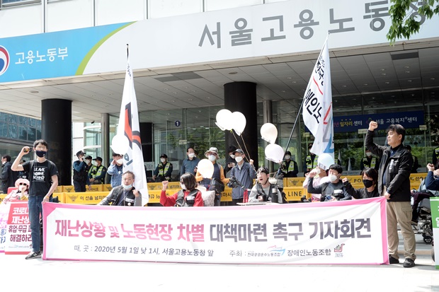 장애인자립생활센터에서 일을 하는 노동자들도 코로나19 사태 이후 고용불안과 차별에 시달리고 있다. 배재현 노조 조직연대국장은 “센터에는 구청에서 관할하는 계약직 일자리가 있다. 코로나 이후 구청에서는 계약직 장애인 노동자들에게 출근을 중지해 달라고 했다”며 “휴업수당 70%를 지급하고 있다지만, 휴업이 길어지면서 계약 종료에 대한 불안감이 있다. 정규직의 경우 계속 출근을 하는데, 계약직만 일을 하지 못하게 하는 것은 평등하지 못한 것 아니냐”고 비판했다.