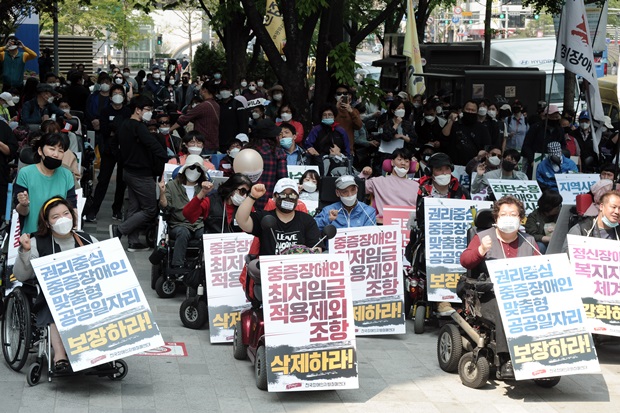 현재 최저임금법(7조)에는 장애인 노동자에 대한 최저임금 적용 제외 조항이 명시 돼 있다. 장애인 생산시설 사업주들은 고용노동부의 인가를 받아, 장애인 노동자들에게 최저임금 미만의 임금을 지급한다. 장애인근로사업장은 최저임금의 80%이상을, 장애인보호작업장은 최저임금의 30~50%만을 지급할 수 있다. 때문에 장애인 노동자들은 상시적인 생활고와 빈곤에 시달린다.