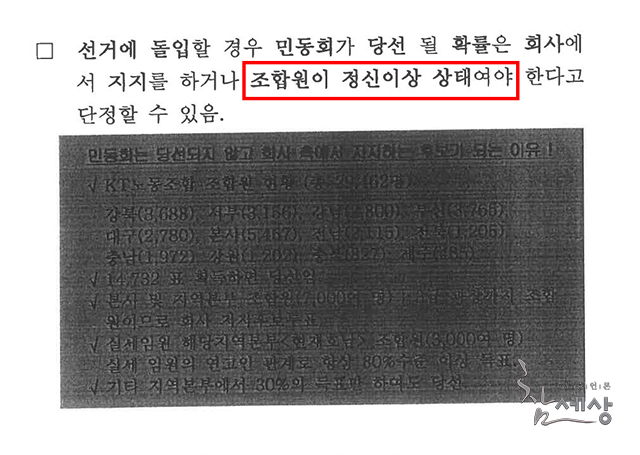 아울러 이동걸은 해당 문건에서 보수파 후보진영이 당선돼 민주노총 탈퇴를 추진할 것이라는 계획도 담았다. 그는 문건에서 “한나라당 책임당원 5년 차이면서 젊고 지역색이 없는, 소신껏 밀어붙이는 성격을 지닌 최○○ 후보가 향후 역할 수행에 최적 인물이라 판단”한다고 밝혔다. 김구현 후보를 ‘최용석(회사) 측 후보’, 최○○ 후보를 ‘뉴라이트 측 후보’라고 분석하기도 했다. 또한 차기 위원장의 역할로는 “정부의 노동정책에 대한 협력적 관계 선언, 기업별 노조의 무쟁의 선언, 합리적 구조조정 시행, 민주노총 탈퇴”가 있어야 한다고 썼다. 아울러 “민동회(KT민주동지회, KT노조 내 민주파)가 당선될 확률은 회사에서 지지하거나 조합원이 정신이상 상태여야 한다고 단정할 수 있다”고 예상했다.