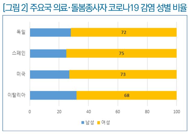 글로벌 헬스 5050 자료에는 의료·돌봄 종사자 감염자 중에서 여성이 차지하는 비중이 스페인 75%, 미국 73%, 독일 72%, 이탈리아 68% 순이라고 나와 있다. 이에 대해 조사처는 “지금까지 돌봄·의료 종사자의 사망률에 대한 국가 수준의 데이터는 거의 발견되지 않았지만, 여성 의료·돌봄 종사자가 남성보다 더 많이 감염·사망한 것으로 추측할 수도 있다”고 설명했다.