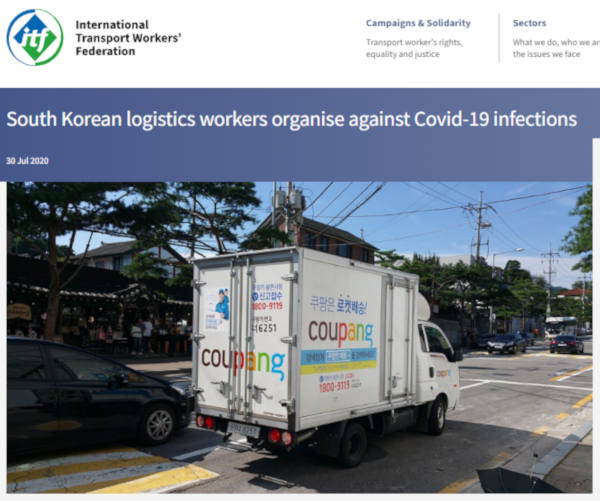 ▲ 국제운수노련은 30일 자체 홈페이지에 쿠팡 노동자들의 노동조건을 소개하고 소속 노동자들에게 쿠팡노동자에 대한 연대를 제안했다. [출처: 국제운수노련(ITF) 홈페이지 화면캡처] |