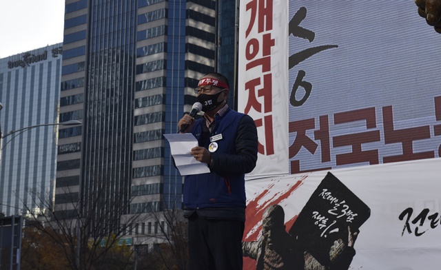 이날 김재하 민주노총 비대위원장은 100만 조합원이 힘을 합쳐 정부의 노동개악을 막아내자고 밝혔다.