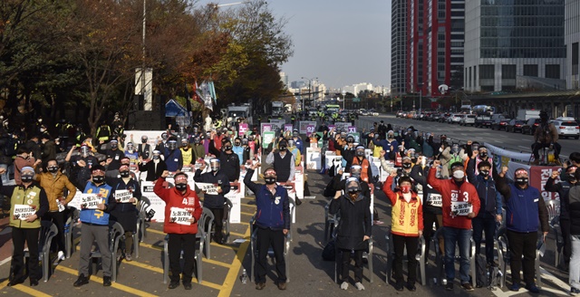 민주노총은 14일 오후 서울 여의대로 여의도공원에서 전태일 50주기 열사정신계승 노동자대회를 개최했다. 이번 대회는 코로나19로 대규모 서울 집중으로 치러지지 않고 서울을 포함한 14개 지역에서 전국 동시다발로 진행됐다. 수도권 대회 역시 여의도 공원 본무대를 중심으로 가맹조직별 27개 거점으로 분산됐다. 코로나 방역수칙을 지키기 위해 각 거점 대회 참가자들은 최대 99명을 넘지 않았다. 본 대회는 유튜브로 생중계됐다.