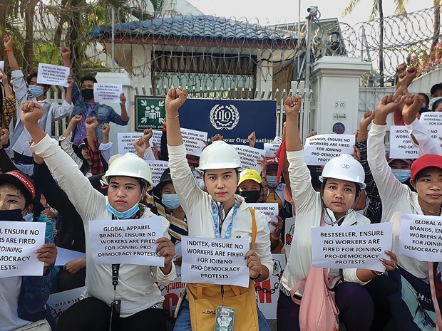 수만 명의 봉제공장 노동자들이 시민불복종에 나선 이유도 군부가 노동자의 권리를 후퇴시킬 것이 분명했기 때문이다. 웨이 씨는 군부가 쿠데타를 감행한 2월 1일부터 노동조합 활동가들과 비밀회의를 시작했다. 5일부터는 현장 선전전과 가두 행진에 나섰다. 노동자들은 NLD를 상징하는 빨간 리본을 달았다. 붉은 천이 부족해 공장에 요청하고 절단기를 이용해 잘랐다. 30분의 점심시간을 이용해, 10분 만에 밥을 욱여넣고 20분 동안 선전전을 했다. 학생들도 그들과 공동투쟁에 나섰다. 6일에는 학생들과 산업공단 도로에서 농성을 했고, 미얀마 중앙은행과 국제노동기구(ILO) 현지 사무소로 행진해 해외 브랜드에 압력을 가했다. 봉제산업이 밀집한 양곤 홀라잉타야에 있는 약 300개의 공장 모두가 투쟁에 참여했다. 공장에 노조가 있으면 파업을 조직했고, 노조가 없는 공장에선 노동자들이 개별적으로 휴가를 내 시위에 참여했다. 군중이 엄청났다.