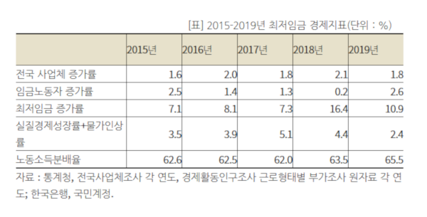 민주노총이 16일 발간한 보도자료에 따르면, 2018년(최임 16.4% 상승)과 2019년(10.9% 상승) 전국사업체 수와 임금노동자의 수가 크게 증가한 것으로 나타났다. 민주노총이 통계청의 전국사업체조사 결과를 분석한 내용에 따르면, 전국 사업체 수는 2017년에 4,019,872개에서 2018년 83,330개 늘어났으며, 2019년에도 73,377개 업체가 늘어나 지난 10년간 사상 최고치에 도달했다. 통계청 전국사업체조사 기준으로 종사자(취업자)도 2017년에 21,626,904명에서 2018년에 22,234,776명, 2019년에 22,723,272명으로 증가했다.
