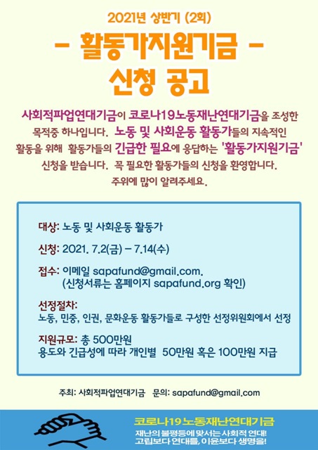 대상은 노동 및 사회운동 활동가이며, 용도와 긴급성에 따라 개인별로 50만 원 혹은 100만 원을 지급한다. 신청기간은 7월 2일부터 14일까지다.