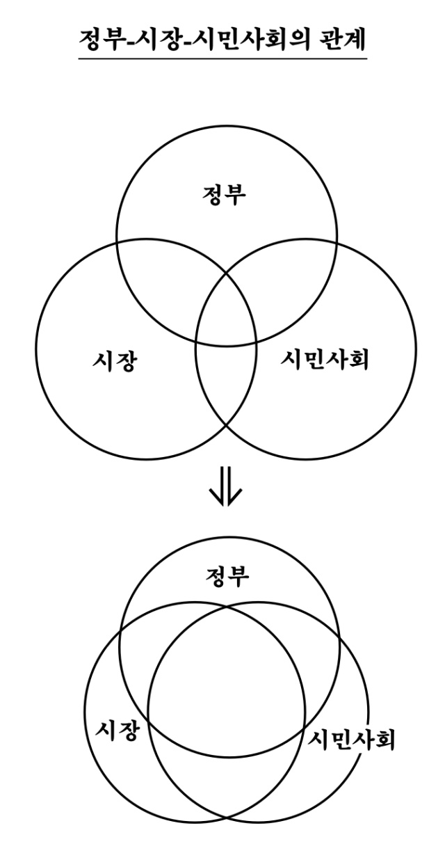 위의 그림은 주류 정치학에서 정부와 시장, 시민사회 사이의 이상적 관계를 묘사할 때 흔히 사용하는 도표다. 상이한 조직과 운영 논리를 가지는 세 영역이 전제되고 영역 간의 부분적인 교차가 묘사된다. 고유한 속성과 자율성을 가지는 각각의 영역이 전제되고 그들 사이의 관계는 균형을 이루는 것으로 설정된다. 실제 현실에서 이와 같은 균형이 이뤄졌던 적은 없지만, 적어도 자율성에 기초한 영역 간의 균형적 관계가 중요하다는 합의를 반영한다. 그러나 오늘날의 현실은 아래 그림에 더 가깝다. 정부와 시장, 시민사회가 가지는 고유성과 자율성의 영역은 급격히 줄었고 세 영역이 겹치는 부분이 가장 커졌다. 그렇다고 각 영역의 고유한 속성을 초월한 새로운 가치나 지향이 만들어진 것은 아니다. 시장에 고유해야 할 이윤 추구, 효율과 경쟁의 논리가 정부와 시민사회를 지배했기 때문이다. 그런데도 권력자들은 현실에서 세 영역의 관계가 위의 그림을 따르는 것처럼 말한다. 이들 간의 협력을 통해 시너지가 발생한다고 선전하면서 힘없는 자들을 동원하고 그들의 의식을 조작한다. 한국의 기후위기 대응에서 이런 현실을 가장 잘 보여주는 것이 ‘2050 탄소중립 컨트롤타워’ 탄소중립위원회(탄중위)다.