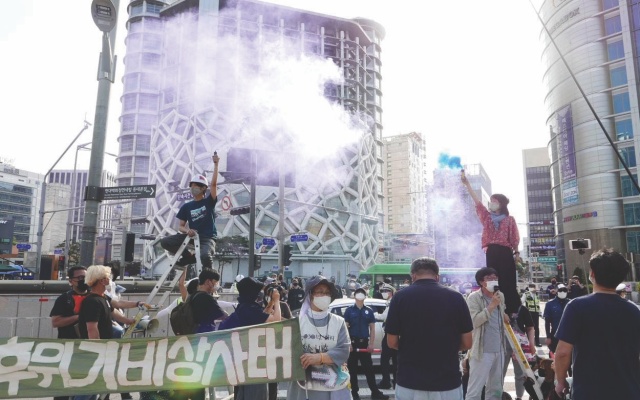 이런 문제의식은 ‘그린뉴딜’, ‘2050 탄소중립’과 같은 정부의 ‘기후위기 대응’ 정책이 본격화하며 더 강화됐다. 정부가 기후위기 대응을 명분으로 기업 지원을 통한 ‘녹색성장’을 추구하면서, 기업의 이윤과 권력이 강화하고 사회 불평등은 증대되고 있다. 정부와 지자체들은 당장의 시급한 에너지 전환 과제는 뒤로 미룬 채 현대자동차를 위해 전기차, 수소차 지원금을 늘리고 있다. 박정희 쿠데타 직후 초국적 화석연료 기업인 걸프 오일(Gulf Oil)과의 제휴로 설립된 대한석유공사(유공)가 모태인 SK는 정부 탄소중립 정책의 가장 큰 수혜자다. 이들은 지난 2년간 빠른 속도로 자회사를 늘리고 있는데, 얼마 전에는 ‘탄소중립 휘발유’라는 얼토당토않은 정책을 당당히 홍보하는 일도 있었다. 이러한 현실에 대한 반발과 저항의 흐름이 커지면서 ‘기후정의’란 용어 사용도 잦아지고 있다.