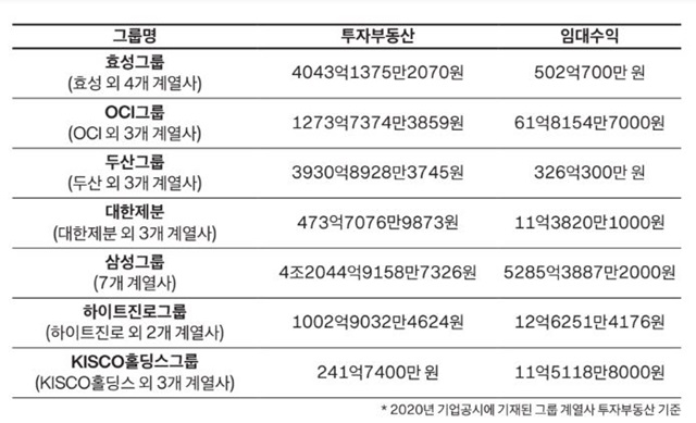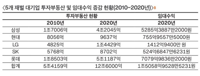 시세차익이나 임대수익을 노리고 사들인 비업무용 투자부동산 자산도 늘었다. 2010년부터 2020년까지 5대 재벌의 투자부동산은 최대 세배 가까이 늘었다. 삼성은 147.2%, 롯데는 176.6%, LG는 198.3%, SK는 50.8%, 현대는 19.6%가 증가했다. 투자부동산에 따른 임대수익은 2020년 한 해만 1조5059억 원에 달했다. 전장호 변혁당 서울시당 대표는 “2012년경부터 지난 10년간 5대 재벌이 사들인 부동산 규모가 서울 면적의 두 배”라며 “2008년 미국발 금융위기 이후 한국 부동산 시장이 침체해 가격이 하락했는데, 당시 재벌 기업들이 상당히 많은 부동산을 사들였다”라고 설명했다.