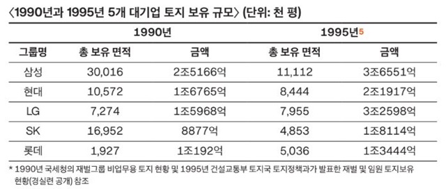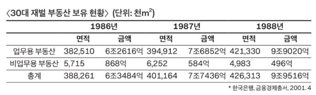 정부는 1974년부터 90년대까지 기업의 비업무용 부동산을 강제 매각도록 하는 규제 정책을 펼쳤지만4 기업의 부동산 투기 열풍은 이어졌다. 기업은 설비투자보다 토지 매입에 더 많은 돈을 써 토지 자산을 빠르게 불려나갔다. 1971년 694억 원이던 제조업 · 대기업의 토지 자산은 1992년 13조 8337억 원으로 20년간 약 200배 늘었다.