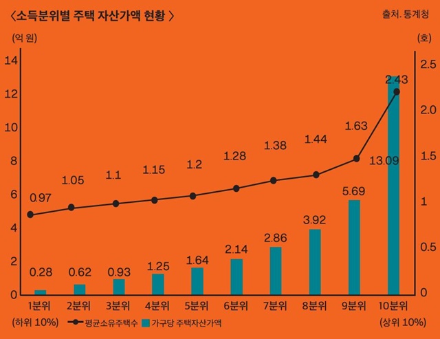 이처럼 정부의 주택정책은 사실상 중산층 혹은, 중산층 이상에 대한 주택 소유 재생산 정책과 다름없다. 이들의 부동산 가격을 지지해주기 위한 부동산 시장 육성 정책인 것이다. 이에 따라 부동산과 주택가격 상승으로 자산 · 주거 불평등 또한 확대됐다. 지난해 11월 주택 자산 가액 기준 상위 10% 가구의 평균 집값은 13억9000만 원으로, 1년간 2억600만 원이 올랐다. 반면 하위 10% 가구는 2,700만 원에서 2,800만 원으로 100만 원 오르는 데 그쳤다. 그 결과 주택 소유 가구 중 상위 10%가 보유한 주택 자산 가격이 하위 10%의 47배에 달했다. 그나마 이 통계는 주택 소유자 사이의 격차일 뿐이다. 집 없는 무주택 가구와는 비교할 수 없을 만큼 불평등이 커졌다.
