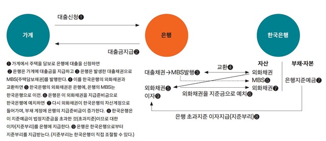 2020년 말 기준, 한국은행의 자산 중 외화채권은 375조 원, 국내 시중은행의 주택담보대출 총액은 473조 원 수준이다. 한국은행은 외화채권을 상당수의 주택담보 대출 채권과 교환할 수 있다. (그림❹) 은행은 외화채권과 교환한 후 다시 해외에 팔 수 있기 때문에 이를 지급준비금으로 예치(❻)하도록 한다. (은행이 지급준비금으로 외화채권을 한국은행에 예탁하면 한국은행은 자산 항목에 외화채권이 다시 들어오고 부채 항목에 은행지준예금이 같은 액수만큼 늘어난다.) 그러면 한국은행은 법정지급 준비금이 초과한 것이므로 초과지준에 대한 이자(지준부리)(❽) 지급으로 모든 교환은 끝이 난다. 그렇게 되면 한국은행이 보유하던 외화채권은 그대로 한국은행이 보유하고, 은행이 가지고 있던 국내 주택담보채권은 한국은행이 소유하게 되며, 대신 한국은행은 시중은행에 대해 초과지준에 대한 이자(지준부리)를 지급하는 형태가 된다.