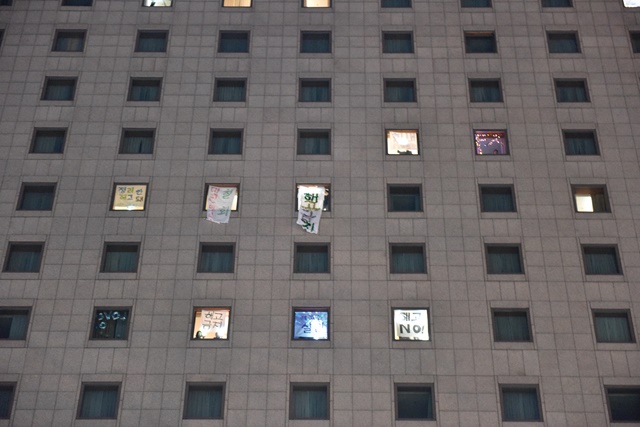 ▲ 세종호텔이 통보한 해고 날짜를 하루 앞두고, 세종호텔 창문에 "해고금지” “해고는 살인" 등이라고 적힌 현수막들이 펼쳐졌다. [출처: 은혜진 기자] |