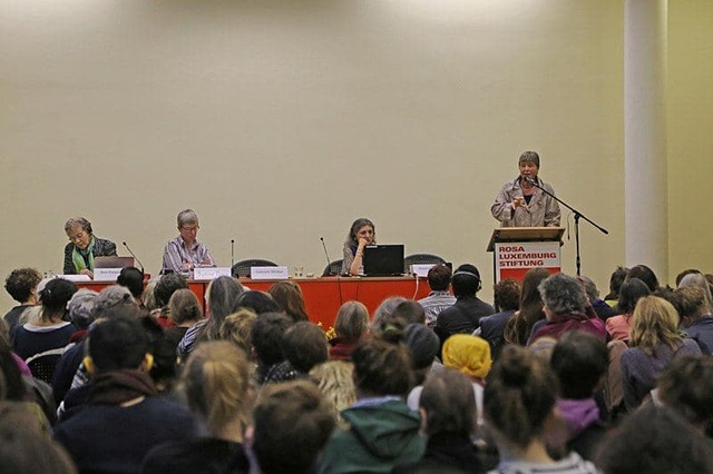 ▲ 가브리엘레 빈커가 2015년 3월 로자룩셈부르크재단 포럼에서 발표하고 있다. [출처: https://commons.wikimedia.org/wiki/File:Ann_Ferguson,_Sabine_Plonz,_Gabriele_Winker,_Sharzad_Mojab.jpg] |