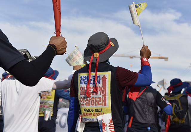 거제도 옥포만에서 이제 51일째 파업 중인 비정규노동자들의 투쟁이 그들만의 이익을 위한 파업이 아니라는 것은 다들 아실 겁니다. 비정규노동이 가장 천대받으며 노동집약적으로 배를 만드는 조선소 파업입니다. 아무리 비정규노동이 공장 내 생산 노동자의 다수가 돼도 그들 다수를 천대하는 다단계 하청구조로 그들의 노동력을 후려칩니다. 필요하면 더 쓰고, 필요 없으면 더 많이 자릅니다. 정규직과의 임금 차이가 절반에 육박합니다. 기본급이 아닌 상여금으로 요술을 부리는데 정규직은 모른 체 묵인합니다. 그렇게라도 해서 절대임금 많이 받으면 좋다는 것입니다. 그리고 비정규직은 사용하는 현장의 연장과 공구도 다릅니다. 연차 10년, 15년 된 숙련 조선노동자의 임금이 최저임금 수준입니다. 노동조합을 만드는 것은 꿈도 꾸지 못합니다. 노동조합이 있는 사업장과 없는 사업장으로 임금이 차별적이라면서 노조가 임금 인상의 주범인양 몰아가는 자본의 논리는 비정규직은 아예 조사대상에서 뺀 결과입니다.