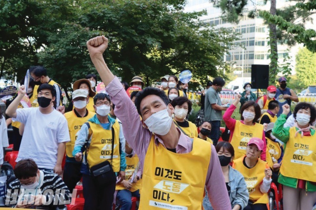 ▲ 권리중심일자리 노동자들이 노동권을 요구하고 있다. [출처: 비마이너] |