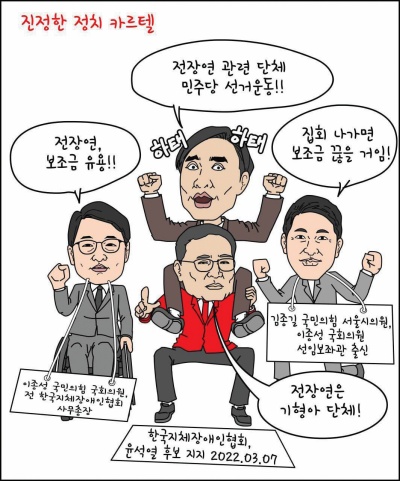 ▲ 전장연에서 발표한 만평. 하태경 시민단체 선진화 특위 위원장이 ‘전장연 죽이기’ 과정에서 사용한 ‘시민단체 3대 카르텔’론 등 괴담 유포를 풍자하고 있다. [출처: 피델체] |