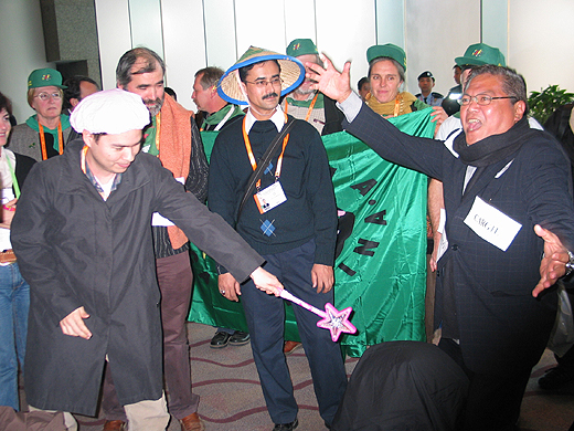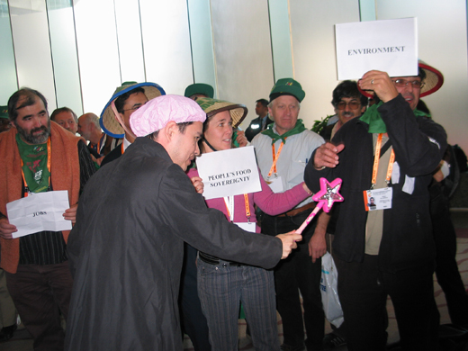 이 때 등장한 전투적 농민. "NO! 전세계 농민, 민중의 이름으로 너를 심판할 것이다"라며 약간(?)의 액션을 가미해 라미 파스칼이 가진 요술봉을 뺏어 파스칼라미를 개구리로 만들고(개구리사진을 이마에 붙여주고) 이후 검은 주머니가 갇힌 식량권, 환경, 물 그리고 일자리 를 끌어내며 초국적 곡물자본과 개구리로 변한 파스칼라미을 오리 걸음식 벌을 세우며 'No WTO!'의 구호를 외치며 퍼포 먼스를 마무리 한다.