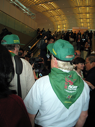 뒤에서 플랭카드를 들고 있던 조제 보베 씨도 "초국적 곡물자본들의 반덤핑이 가족농 및 전세계 농민들의 숨통을 조이고 있다. 이런 행보는 멈춰져야 한다. 또한 당국은 이런 협상을 멈춰야 한다"라며 "WTO는 모든 농업, 물, 환경 모든 것을 상품으로 만들고 있다. 우리는 국제적으로 이에 대항해 싸우고 있다. 어제 밖에서 수백의 농민이 싸웠고 지금도 계속 싸우고 있다. 미국과 유럽 초국적 곡물자본을 위시로 한 그들은 우리의 목소리에 귀를 기울여야 한다"고 주장했다.