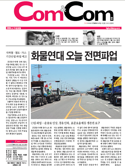 ‘Com&Com 꼼꼼’ 첫 호에는 오늘 파업에 들어간 화물연대 노동자들의 소식과 공기업 민영화 문제를 담고 있으며, 촛불 소식은 섹션을 따로 마련해 다양한 소식을 담았다. 재미있는 만화도 있으니, 퇴근길 ‘꼼꼼’에 손을 뻗어보자.
