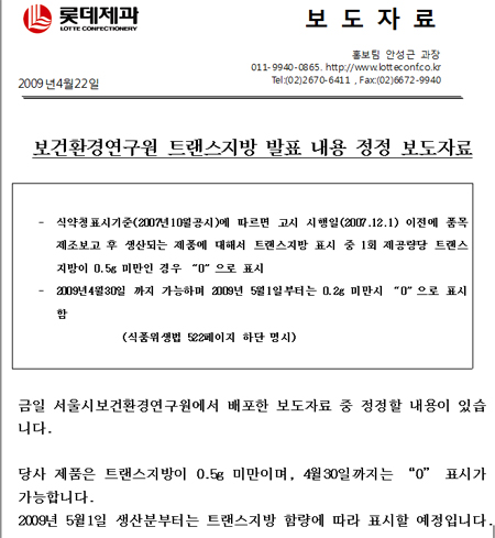 롯데제과 해당 제품들은 트랜스지방 함유량이 0.2g을 초과하지만 종전 규정인 0.5g은 넘지 않으므로 표시기준 위반이 아니라는 얘기다. 그러면서 롯데제과 측은 "2009년 5월1일 생산분부터 트랜스지방 함량에 따라 표시할 예정"이라고 밝혔다.