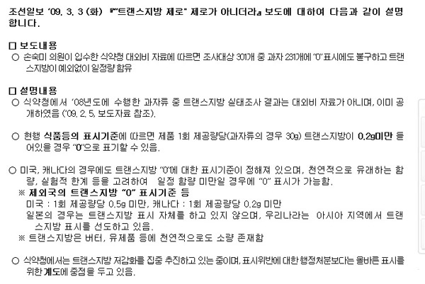 식약청 영양평가과 관계자는 "당시 조선일보 보도가 트랜스지방이 0.2g 미만 함유된 제품에 대해서도 문제제기를 해 '0.2g 포함은 0으로 표시할 수 있다'는 걸 강조하기 위해서 낸 자료"라고 해명했다.