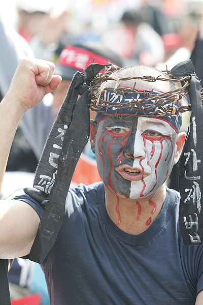 문화공연도 전국학생행진의 새내기 율동공연이 무대에 올랐다. 전국학생행진은 한국대학생연합과는 다른 노선의 학생 단체다. 민주노총의 넓어진 연대의 폭과 소수에 대한 배려가 공연에도 묻어났다. 20여 명의 대학생 새내기 공연은 서툴고 박자를 놓쳐 자주 틀리긴 했지만 잘 짜여지고 다소 딱딱한 노동자 집회와는 달리 재기발랄했다.