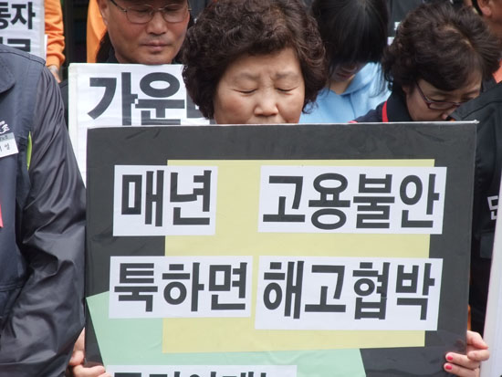 박명석 공공노조 서경지부 지부장은 “작년 교섭 때 정년이 된 사람은 의논과정을 거쳐 점진적인 계획에 의해 내보내기로 했지만 학교는 신규 계약을 빌미로 논의절차 없이 한 번에 정리하려 하고 있다”고 비판했다. 이어 “인원충원을 하면서도 해고를 하는 등 납득이 되지 않는 학교 측의 행동은 결국 노조탄압이 목적일 것”이라고 주장했다.