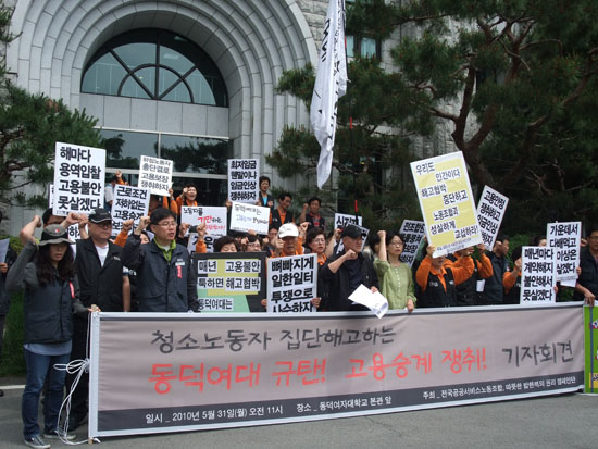 한편 집단해고와 관련해 공공노조 서경지부 동덕여대분회 미화노동자들은 31일 오전 11시, 동덕여대 본관 앞에서 ‘동덕여대 학교 당국 규탄, 고용승계 쟁취’ 기자회견을 열고 입장을 밝혔다..