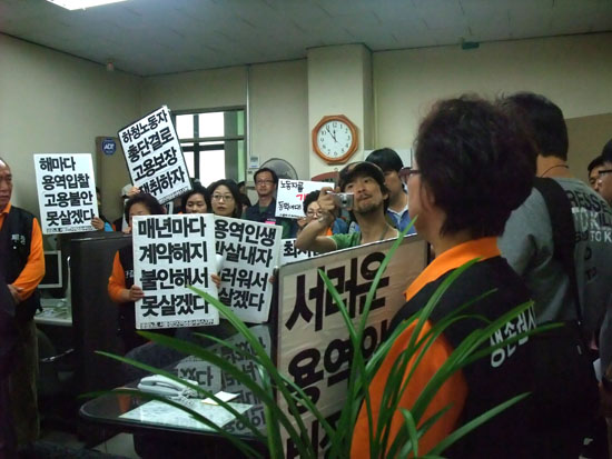 권태훈 공공노조 서경지부 조직부장은 “용역업체는 조합원들에게 개별적으로 전화와 문자를 하며 조합 내부를 파괴하려 하고 있다”면서 “교섭을 요구하자 교섭할 수 없다며 응하지 않고 있다”고 밝혔다.
