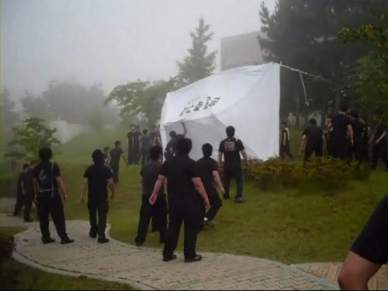 ▲ 지난 6월 17일 새벽 회사가 고용한 용역들이 전남 나주공장 한국쓰리엠지회의 농성 천막을 철거했다. [출처: 금속노동자] |