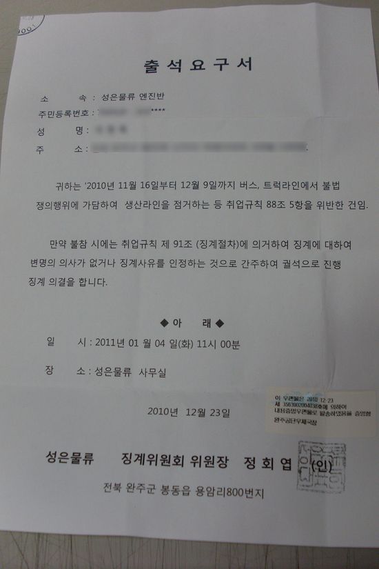 23일부터 진행된 징계위원회 출석 통보는 파업에 참가한 모든 조합원을 대상으로 이루어지는 것으로 알려졌다.