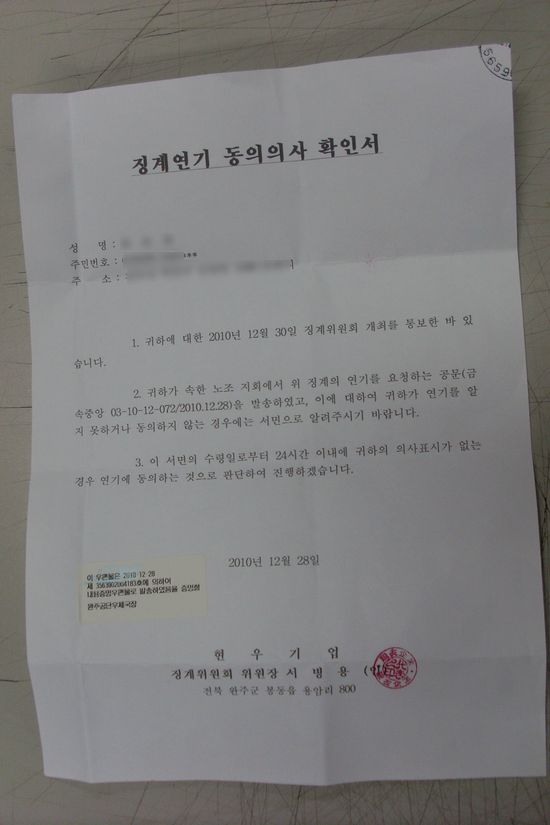 ▲ 징계위원회 출석요구서와 징계위원회 연기통보서 [출처: 참소리] |