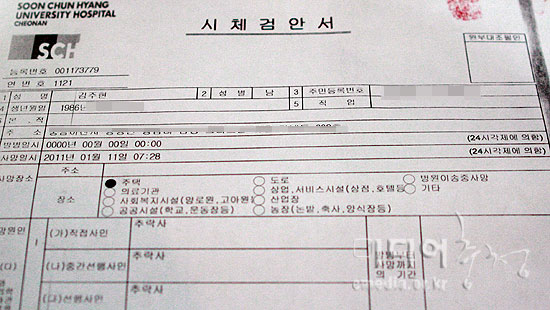 결국 김 씨는 병가를 마치고 첫 출근해 11일 아침8시 일을 시작하는 날 새벽5시59분, 어머니, 아버지, 누나에게 똑같이 ‘엄마 아빠 누나 힘내시구 미안합니다’는 문자를 남겼다. 불안한 가족들은 바로 전화했지만, 김 씨는 계속 전화를 받지 않았고, 복도형 아파트 기숙사 13층에서 몸을 던졌다. ‘추락사’. 병원 측은 아침7시28분으로 사망시간을 추정했다.