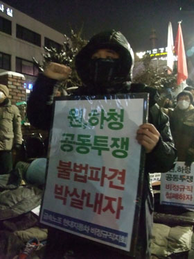 한편 이 자리에는 20명의 현대차 비정규직 조합원 외에도 기륭전자분회, 사회진보연대, 진보신당, 사노위, 다함께, 전국학생행진 회원 80여 명이 참가했다. 이들은 한파 속에서도 약 1시간 30분간의 집회를 진행하며 현대차 비정규직 투쟁에 함께 할 것을 결의했다. 김은주 진보신당 부대표는 “교섭국면에서 쓴 잔을 맛 본 만큼, 현장 중심으로 한 새로운 투쟁을 전개하자”며 “연대 단위들 역시 결의와 투쟁을 2배 이상 다져나갈 것”이라고 밝혔다.