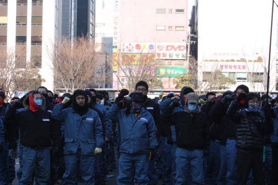 이어 "우리는 투쟁을 멈출 수가 없다. 인간답게 사는 노동자의 미래를 포기할 수 없다"며 "한진중공업 투쟁에서부터 승리의 깃발을 들어올리는 출발을 함께하자. 전주에는 버스기사들이 파업하고 있고 서울에서는 홍익대 늙은 노동자들이 이 추운 겨울을 투쟁으로 이겨나가고 있다. 현대차비정규직노동자들은 위대한 투쟁을 전개했지만 지금 투쟁의 전열을 가다듬고 있다. 전국의 투쟁 진지를 모으고 민주노총이 단일한 전선으로 묶어세워서 일어섰으면 좋겠다"고 말했다.