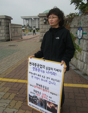 ▲ 현대미포조선 현장노동자투쟁위원회 김석진의장인 남편과 함께 2년간 현대중공업과 경찰청을 상대로 투쟁을 벌이고 있는 한미선씨. 이 글의 필자다. |