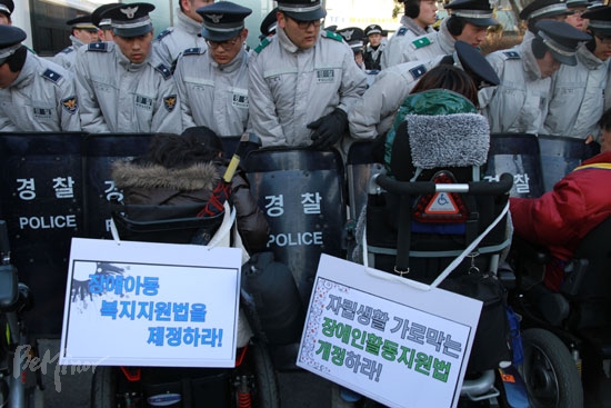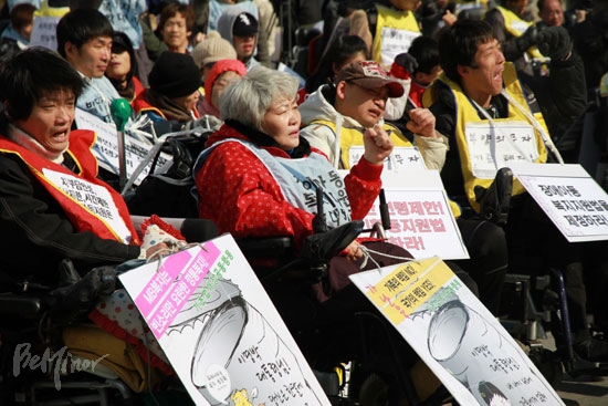 장애인활동지원법·국민기초생활보장법 개정, 장애아동복지지원법 제정 등 3대 법안의 제·개정을 촉구하는 전국결의대회가 200여 명이 참가한 가운데 전국장애인차별철폐연대(아래 전장연) 주최로 2일 늦은 2시 종로 보신각 앞에서 열렸다.
