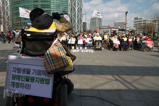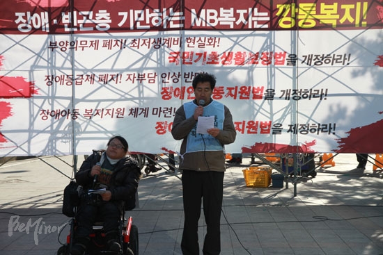 이날 결의대회에서 전장연 박명애 공동대표는 “장애인이 일할 수 없다면 비록 쥐꼬리만큼이라도 기초생활보장제도의 급여를 받아 생활해야 하는데, 이마저도 부양의무자 기준 때문에 받지 못하는 등 국가가 가족에게 그 책임을 미루고 있다”라고 지적하고 “요즘 누구나 복지를 이야기하지만, 우리의 권리와 우리가 살아갈 세상은 우리가 만들었다고 당당히 말할 수 있도록 하자”라고 강조했다.