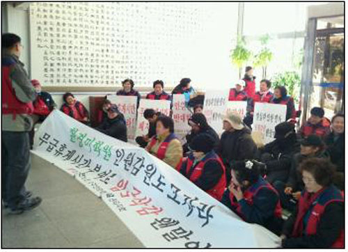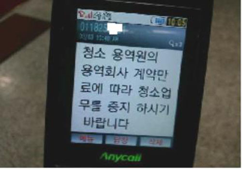 새해 들어 유독 청소노동자들의 임금과 근로조건 등이 사람들의 입에 오르내리고 있지만, 여전히 사회 곳곳에서 부당 임금과 노동에 시달리는 청소노동자들은 많다. 최저임금은 고사하고 업체 선정에 따라 일용직으로 전락하게 되는 경우도 있다. 지난 3월 3일, 학교 측으로부터 문자로 전원 해고를 통보받은 대구한의대 청소노동자들의 경우가 그렇다.
