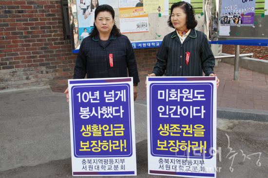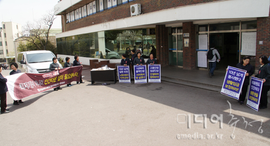 문설희 전국공공서비스노조 평등지부 공공조직부장은 “30명중에 27명이 노동조합에 가입했고, 대부분 10년 넘게 일을 했는데 우리를 빼고 무슨 교섭을 하겠다는 건지 이해 할 수가 없다”며, “10년 동안 최저임금에 연차수당도 못 받고 억눌려 살아온 청소노동자들의 실질적인 자유, 생존권을 교묘히 짓밟으려는 태도가 너무나 괘씸하다”고 말했다.