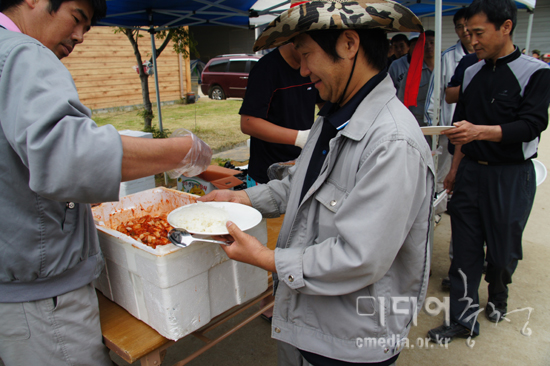 500백여명의 노조(금속노조 소속 유성기업지회) 조합원들은 조를 나눠 3일에 한 번, 혹은 일주일에 한 번 집에서 가족들의 얼굴을 보고 오지만 대부분 비닐하우스에서 잠을 잔다. 아침 7시 30분 식사조 조합원들이 자발적으로 준비하는 맛있는 밥 한 끼는 먹고 나서, “잘 먹었습니다”고 인사를 나눈뒤 집회를 한다.