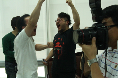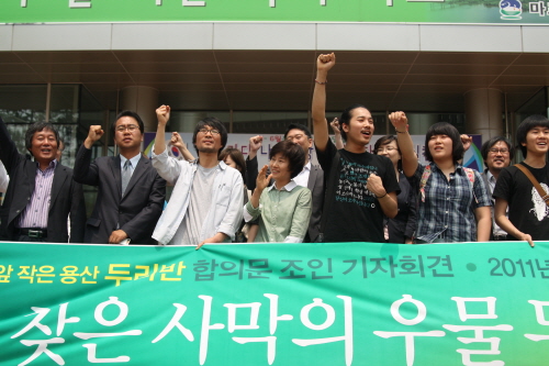 우여곡절 끝에 참관인이 모두 모인 12시가 되어서야 조인식이 시작됐다. 안종녀 두리반 철대위원장과 진병주 남전디앤씨 대표이사는 각각 합의문을 확인하고 사인을 했다. 사회자의 권유에 따라 양측이 악수를 하는 순간 531일 동안 기다려온 환호와 박수가 식장 곳곳에서 터져 나왔다.