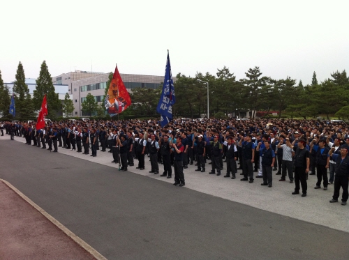 ▲ 1천여 명의 노동자들이 본관 앞에 모여 사측에 4대 의제 수용을 강력하게 요구하고 있다. [출처: 참소리] |