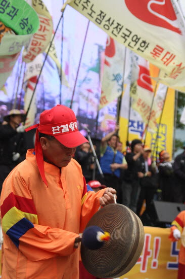 연대사에 나선 이정희 민주노동당 대표는 “경찰과 구청은 경비업법, 행정대집행, 도로교통법 등 늘 법을 이야기하지만 그 법이 뭐 별거냐. 우리가 원하는 법, 인간답게 살 수 있는 법을 만들면 되는 것”이라며 “진보정치 대통합 성공시켜서 꼭 만들어내겠다”고 약속했다.